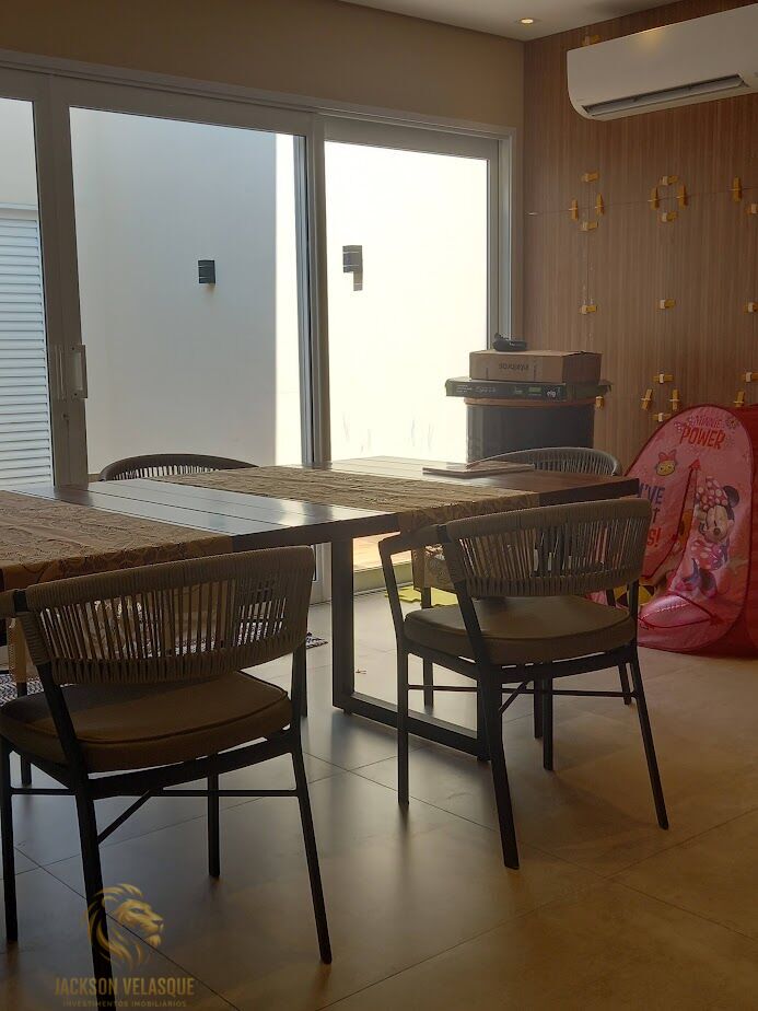 Ambientes: 2 suítes, sendo uma master com 2 banheiros, sala de estar integrada com a sala de jantar, home office, cozinha toda equipada com móveis planejados, espaço gourmet com adega de vinho e cafeteira lavanderia, espaço externo brinquedoteca, chuveiro externo, banho externo, lavabo, 2 vagas de garagem cobertas.